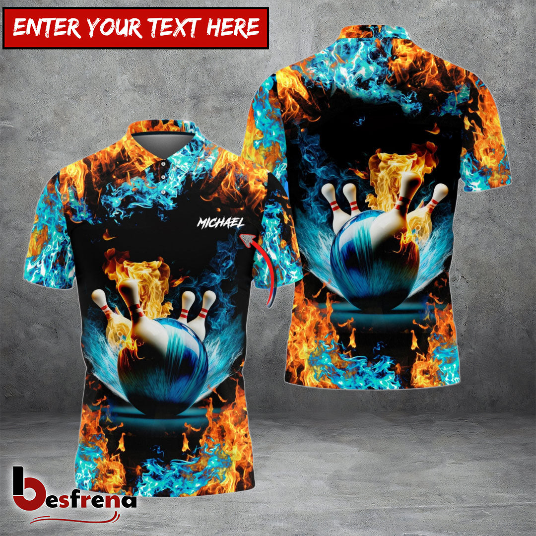 Besfrend Blue Bowling Ball And Pins On Fire Customized Name 3D Shirt